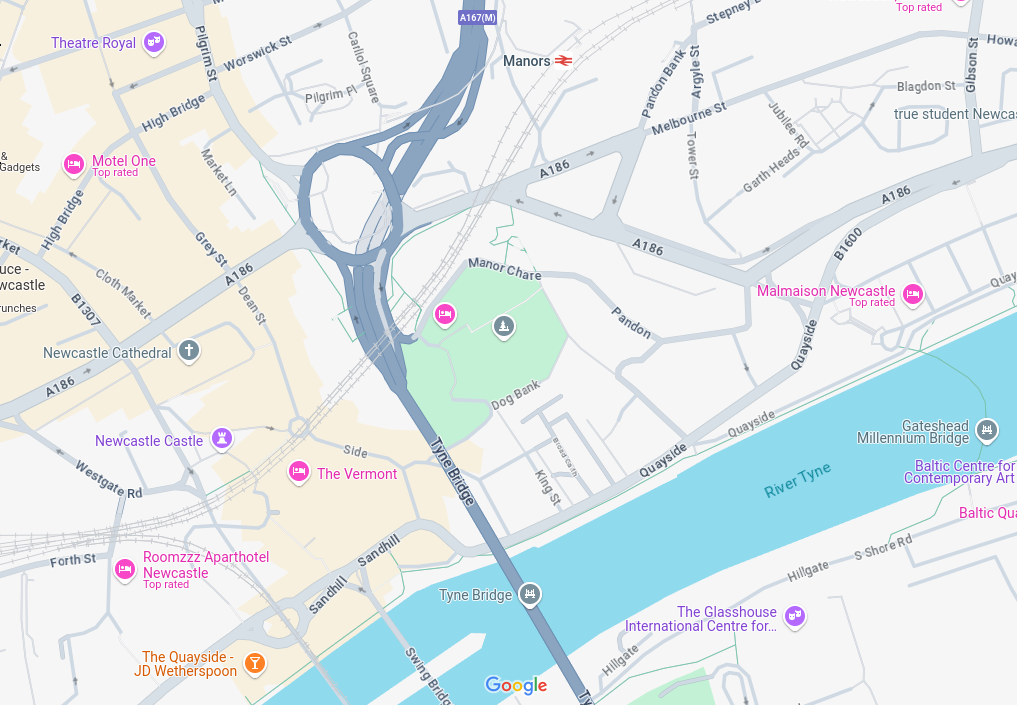 Follow Grey Street south to join Dean Street, then contiue south on The Side.
